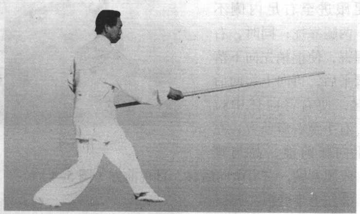 左足不动,重心前 移,右足向前上一大步, 落地站稳,右膝部弯曲。