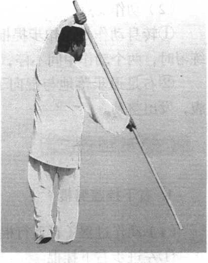起,略高过头,左手腕内旋 外翻;右手握棍微向前滑把, 使手心向前,棍身斜置于体 前,棍梢略低于膝;目视棍 前段(图5-6 )0