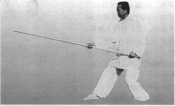 ③左足上步与棍向前下劈落,要整齐一致,步到棍到,上 下相齐。