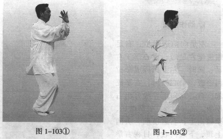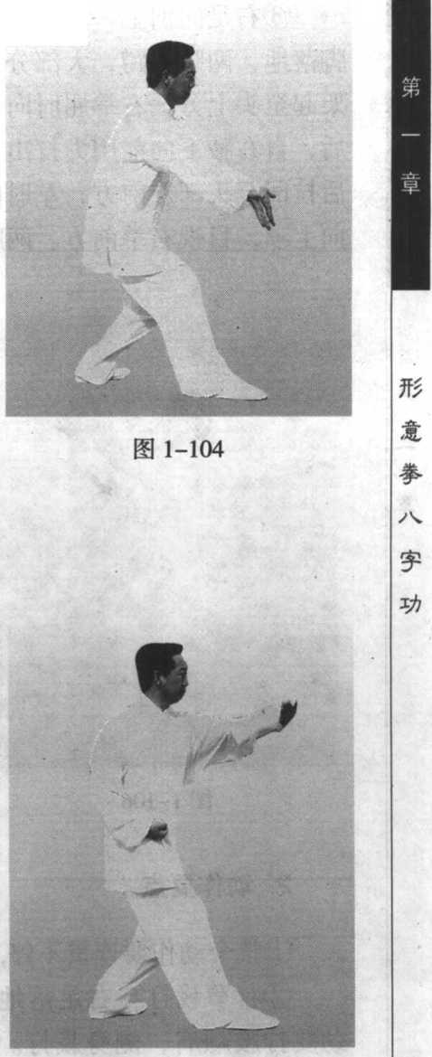 在左足;同时,两掌自腰间 向前、向下推出,掌心高与 腹齐,两掌相距10厘米,掌 指向下,掌心向前;头向上 顶,沉肩合肘,目视两掌前 方(图 1-104)。