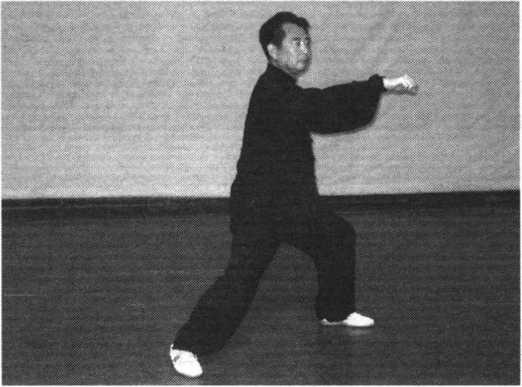 3 .右脚擦地面向前迈出一大步,左掌同时前伸,右拳顺左臂里 I