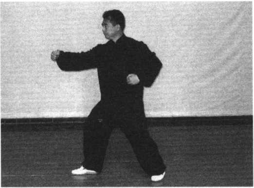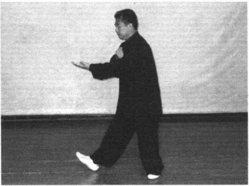 4 .接着右脚落实,右臂横着顺左臂向前发劲,拳心向里。同时 左肘发力后撑,随之左脚擦地跟进半步。这是右拳、右脚和左肘并 用的动作,右臂、左肘、左脚擦地跟进要同时完成。劲要发的一致,