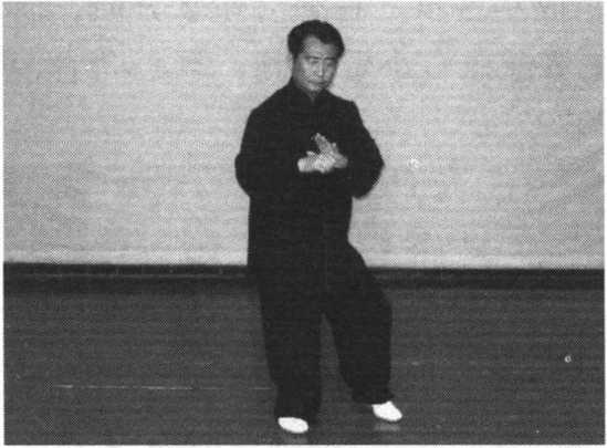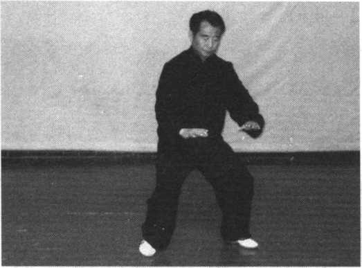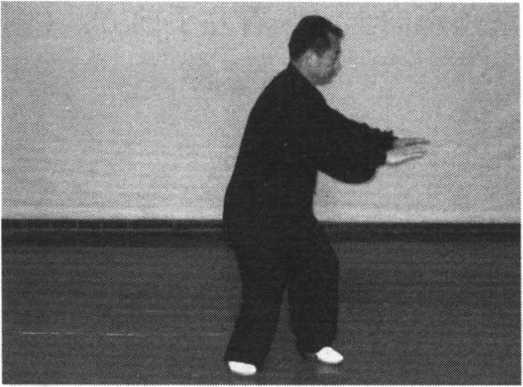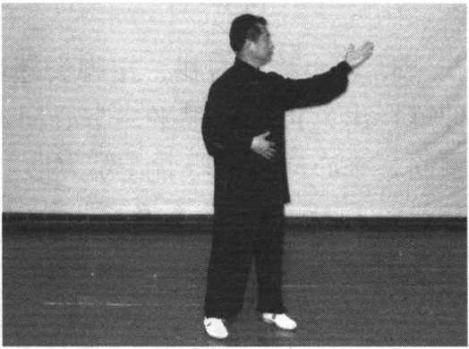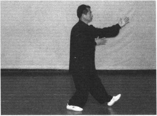 1 .身微向右转,重心移向左腿,落平左脚,弓步,两手下按腹 前向右前推按,重心均向两腿,眼看右手前方。(图38 -39)