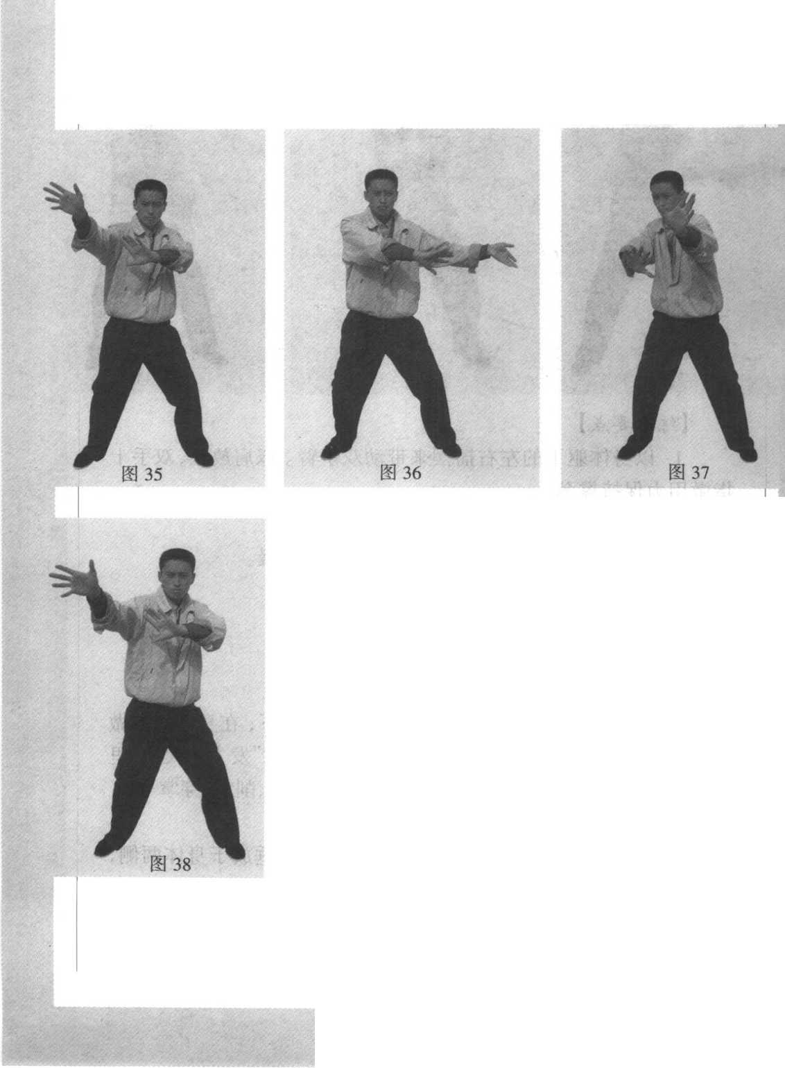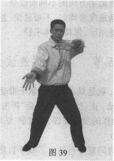 依次做横“8”字挥动。双腿随双手臂的挥动而同时运动,脚趾抓 地站牢。双手运动范围,上与头齐,下与腹平,左右不可离肩部太 远。头部随双手运动方向而转动,双眼始终注视双手(图35、36、 37.38 Jo
