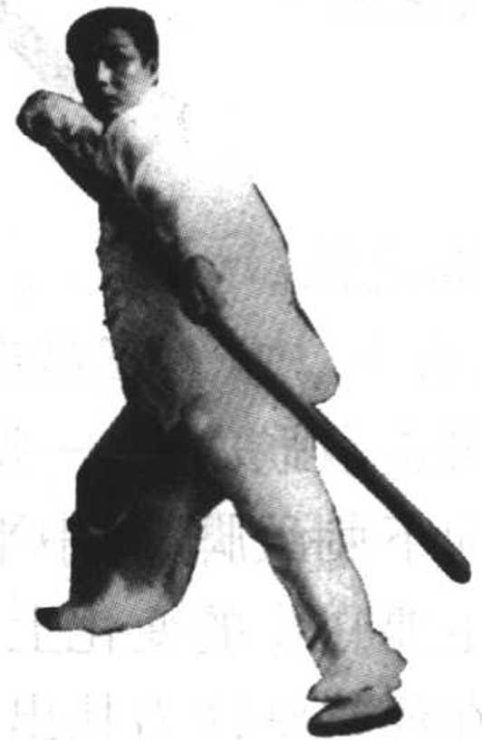 承上式,上左脚一步,双手按劈,枪在腰间。上右脚扎枪,右 腿为弓步,左腿蹬直;前手心向上,后手心向下、向后捋按枪,枪 头向下劈、拿、沉、压,身体随之右转90。,目视身后枪头(图2 - 28)。拖枪为败势身法,但不能松懈,要迈步轻灵自然,周身合一,