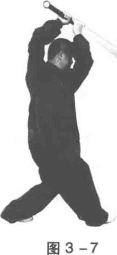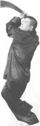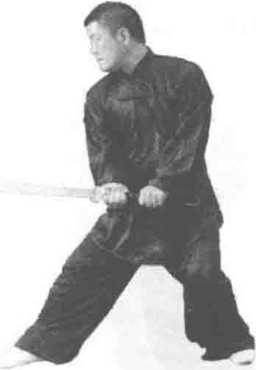 2 .右脚后撤成三体桩步,同时两手向下猛带于小 腹前,使刀背向后绷挂,刀尖斜向上45度。目视刀尖 (图 3-10)。