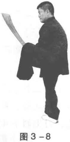 接(图3-6)右脚上步身体左转180度,双手持 刀刀尖贴身体左侧向后、向下扎,随转身刀上挑。同时 提左膝成提膝挑刀,双手握刀左手前、右手后,停于腹 前左小腿内侧。目视前方(图3-7、图3-8)。