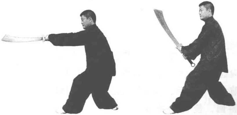 1 .向前落左步,左手前右手后双手握刀向前送刺, 高与肩平。目视前方(图3-9)。