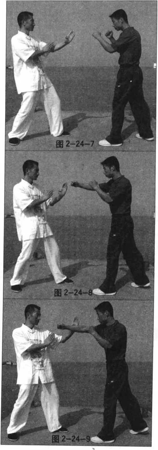 当对方用右冲拳向我上 (中)盘攻来时,我则直接用左 手向右(内)侧进行快速拍挡(图 2-24-7, 8、9),消解其攻击:
