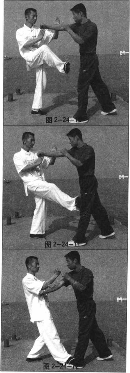 接下来,快速抬右脚踹向对 方前腿(图 2-24-10. 11);