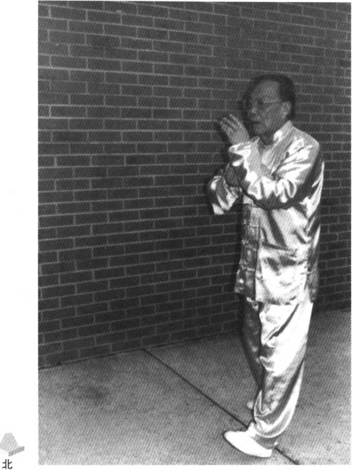 再蹬右足,左脚上半步,足跟着地,渐随右足前蹬成左 弓箭步。左臂亦一起逆时钟扭动,至掌心向上,跟腰右转, 先搠往右前方45°;右掌在左腕下,双臂一起向左,再随腰 左转,去左前45。握按。左手于外搦时,不断扭转,在左前 45。近脸前左斜方横置前臂,掌指向右上,掌心朝外,左肘 向下;右掌然后从左腕下穿出,往左前方伸按。目视东北 方。如上另一角度图。