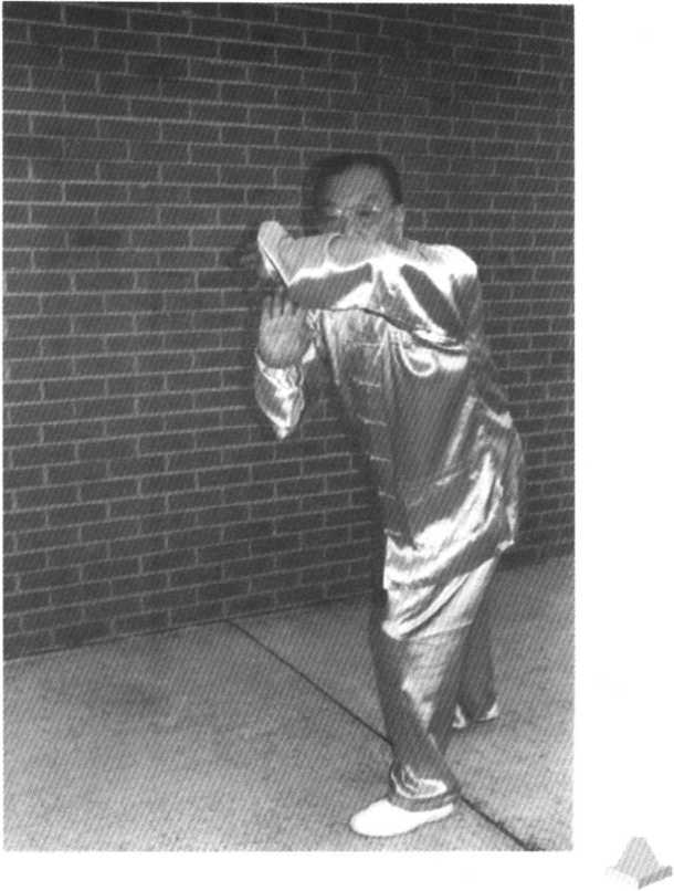 然后,重心荡右下沉,腰往右转,左手先向下逆转近腹 前,右手回搬至掌心朝左,贴近左肩。收回左腿,贴近右足 踝。然后右脚蹬前,左足迈步,足跟着地。腰继续往右转,令 双臂于上左步时,向右前45。再撷去;而左掌则顺时钟转至 掌心朝上,右掌下落至贴左腕。随即跟腰胯左旋,双臂继续 向左前45发4弧搪抹。目视左掌大拇指根节。如上另一角度 图。