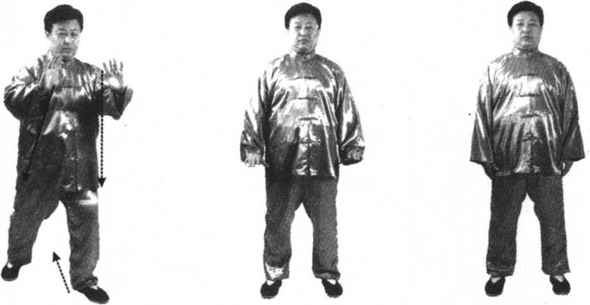 重心渐渐全部移于左腿坐实,右腿 提起向后撤半步,先以脚趾着地,随着重 心后移右脚跟内收踏实;同时,腰微右 转,面向正南方(离),重心渐渐全部移于 右腿坐实,左脚提起向后撤半步与右脚 落平,距离与肩同宽,先以脚趾着地,随 着重心左移使全脚踏实;同时,两腿立 起;两掌随撤步臂内旋落于两胯旁,掌心向内,指尖朝下,复原于无极状态(图6-442、图6-443、图6 -444 )oS 6-444图 6-442图 6-443要领合太极即为复原于无极,由动变静。由第一式无极变为太 极复始,连绵不断。