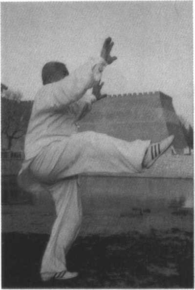 动作六:承前式,右腿由 屈至伸,向东南前方踢出;同 时两手左右分劈,屈肘、竖 掌,右手臂与右腿上下相照, 目视右掌前方。(图86)