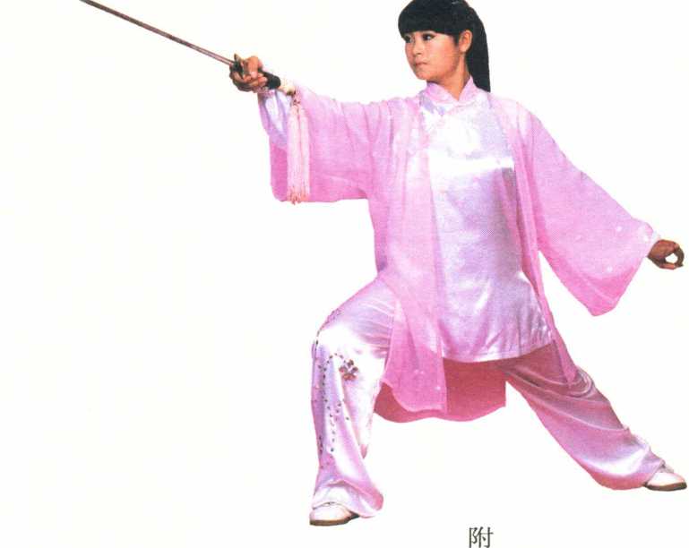 2. 击剑也叫平崩剑,是用剑刃前端向左(右)敲击,力注剑端。向 左为正击,向右为反击。做本式反击剑时,要在向右转体的带动下, 将剑向右上方击打,右臂、腕先屈后伸,使方达剑刃前端;左剑指向 左下方对祢展开。