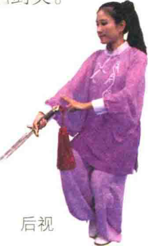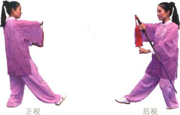 上体左转,右手持剑自前向下、向后划弧,使剑斜置于身体左下方, 手心斜向上,剑尖斜向下,与膝齐高;左手剑指摆转至右肩前;目视剑尖。