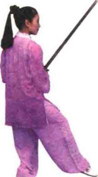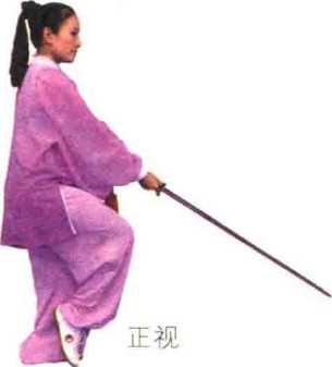 (3) 定势时,虚步抱剑,两臂撑圆’上体左转,剑尖斜向右上方, 同时■头向右扭转,两肩要松沉’剑把与身体相距约10厘米。