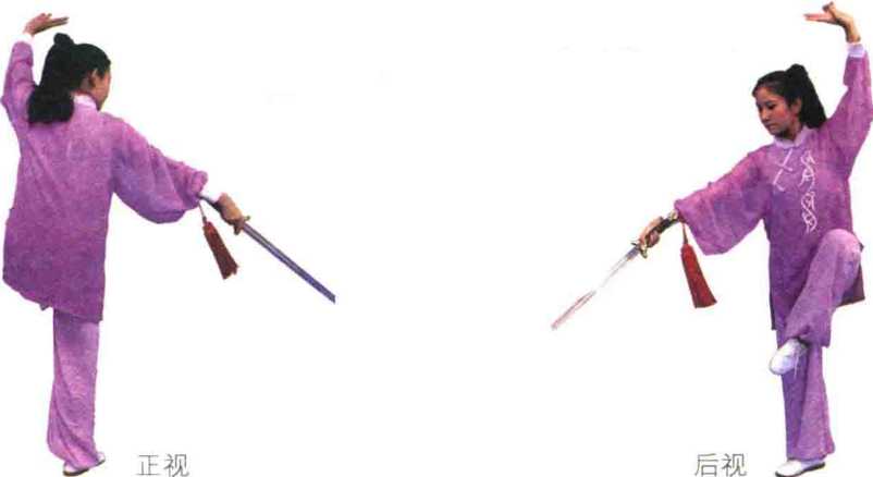 上动不停,右脚向前上一步,右腿直立支撑身体,左腿屈膝提起成 独、/步;同时上体右转,右手持剑向上、向前下方立剑劈下,力达剑前部, 虎口向上,剑尖稍高于膝;左手剑指随转体自身体左侧向下、向后摆转 至左额上方,手心向上;目视剑尖,胸向东南。