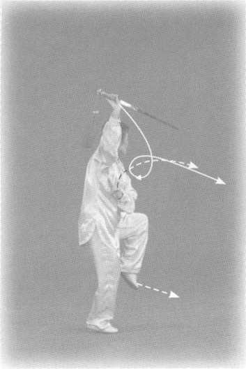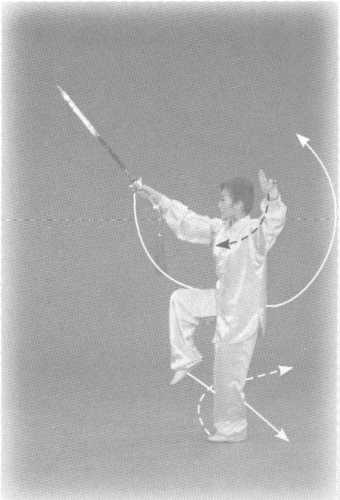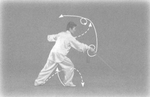 (腕花跳转)右手持剑下落,右 脚下落蹬地跳起;随身 体向右后转动,左脚跳 起落地,右脚抬起。同时,右手 持剑内旋上举随转身在头前做腕 花,左剑指架于左额前。目随剑 动。要点:。靛上专动作应特别注意身、 手、步与器械的协调配合。。落剑、落步向东,跳转 180°向西做腕花。马春喜 套路