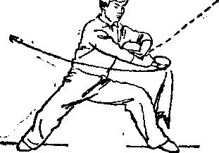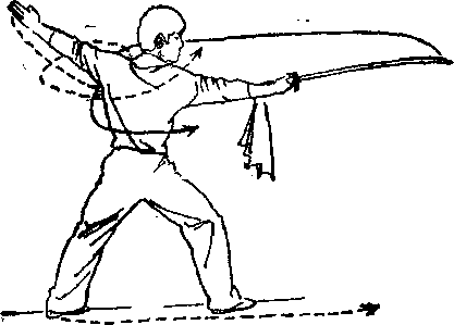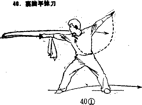 ? 嵬体塞转,左相商容的宿科步右手持力向左 经左臂外侧绕行至身后,刀背贴身,刀尖向下.左手先屈肘 收至胸前再伸直向左分开事目视前方# (图39?)