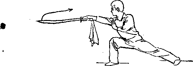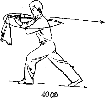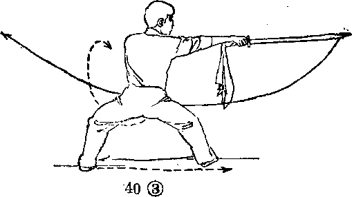 (图4。①、 ② 身体右转,右唧向后退一步:右手持刀臂外旋上举, 响后经背部向左肩绕行,刀背喂海,刀尖向后,左手屈肘改 至胸乱(图40? 击去M金 ? 上体右转,右手持刀向右平抹,刃刃向后,刀尖向 志§目视刀尖。(图40③) 41.秘跳步扎刀 41 双脚同时僵地微离地面,在空中向左后方转体,落地成 右弓步右手持刀臂内旋向下、向左经腹前向前立刀扎出. 左手向下、向左摆功,屈肘收至右上臂内侧m目视右前方? (图 41) 笫四段