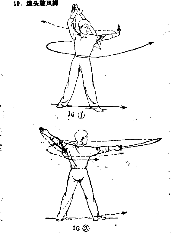 ⑤ 右脚麓她起峋至脚闻上摆起,身摔踌空左转.看 II伸直向在、向上里合摆起右手持方向下、向左肪处平扫, 左手皿菌建击右脚押掌# 皿礴)