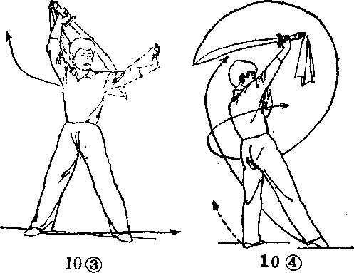④ 身摔经左向启转.右惭向右上一垣脚前掌点地, 右手持月精转体向上绕行,左手期肘收窒去上宥内侧MIW0 ?)
