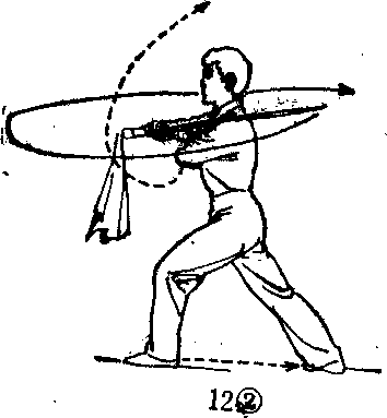 ① 上体略左转,右手持刀向左篁左臂外侧向背后绕 行,左臂先屈肘收至胸前,再直臂向左平分『(图侦①)