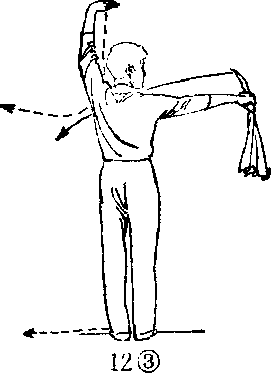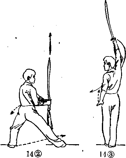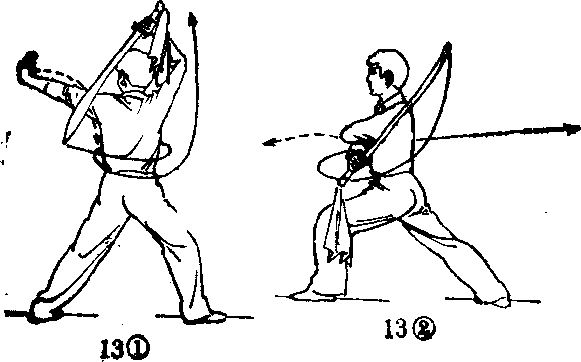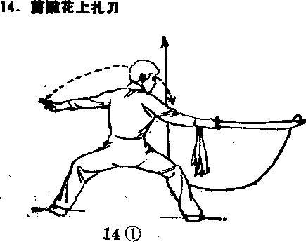 ? 左脚向右脚并拢,阈腿直立,上体右转#右手特刀 经前向右平斩,手心向卞,刀尖向nt左手向下向左、向 上架掌于头上方,目视右前方。(图12?)
