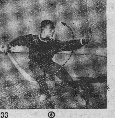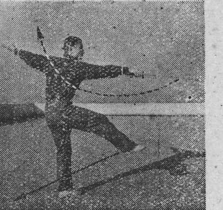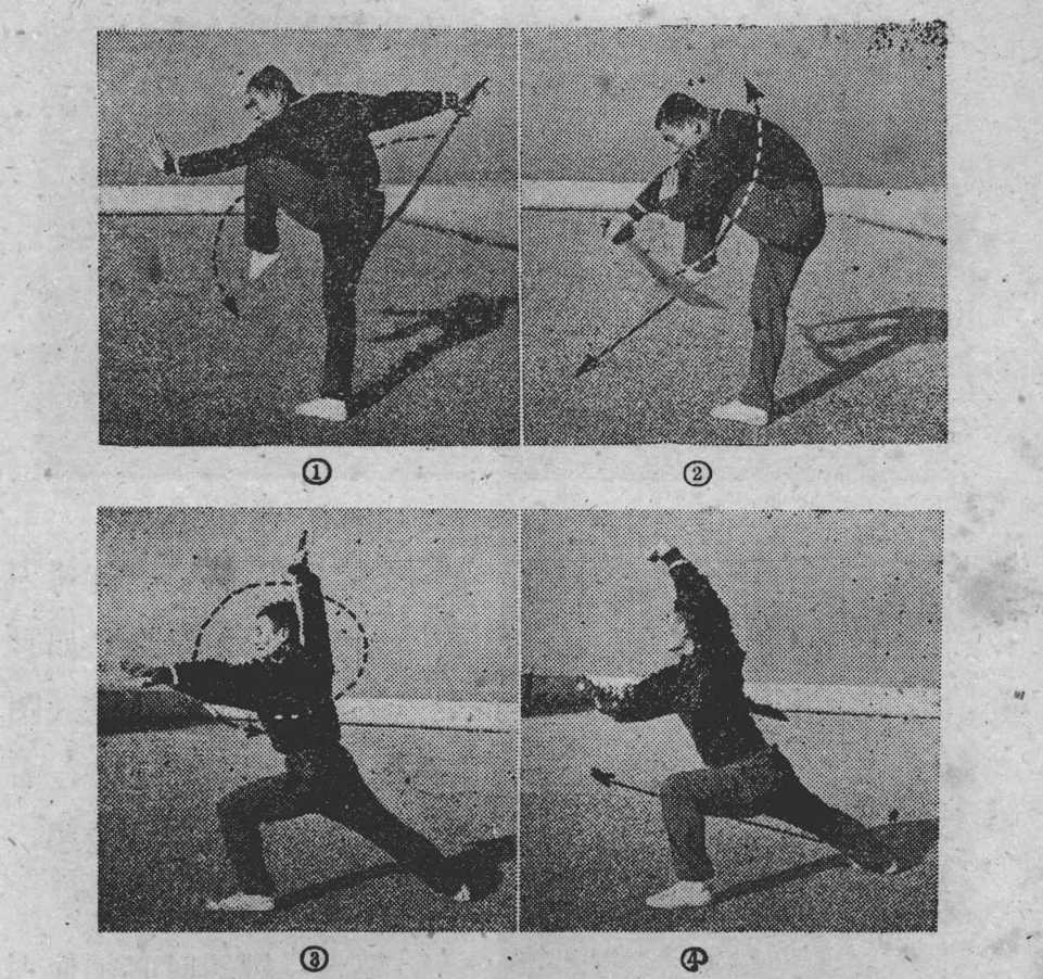 动作:①右腿伸直立起,左腿屈膝提步离地;右手持刀 向右后拉回,左掌向左前伸去?(图32之①);②上身左