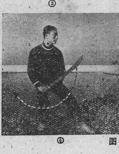 左腿屈膝;右手持刀从后向 前由左膝下方朝左裹膝抄起,左 掌屈肘附于右小臂(图32之②); (。右手持刀从左肩外侧向后Ji? ff 背^行,左脚即向左赫前方落步, 左掌向左平摆(图32之③);④左 腿屈膝半蹲,右腿挺膝伸直,成 左势弓箭步,右手持刀从背后向 右、向前、向左胁^环平扫,至左
