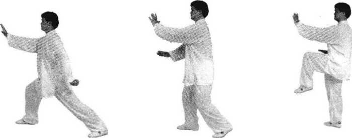 5. Raise your left knee slowly as your left hand flattens and swings to the front, passing the outside of your left leg. Your left elbow should be bent just youfe your left knee, fingers pointing up and palm facing rightward. Youte your right hand to the side of your right hip, fingers pointing forward, palm down. Look at your left hand (fig. 4-1-138, 4-1-139).