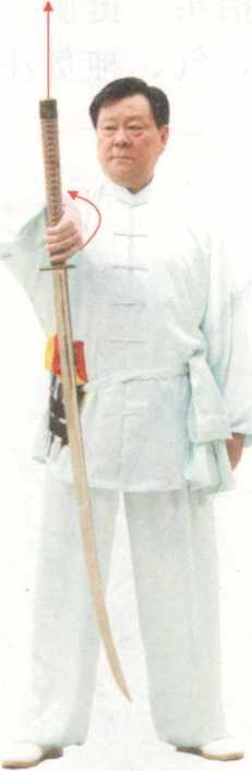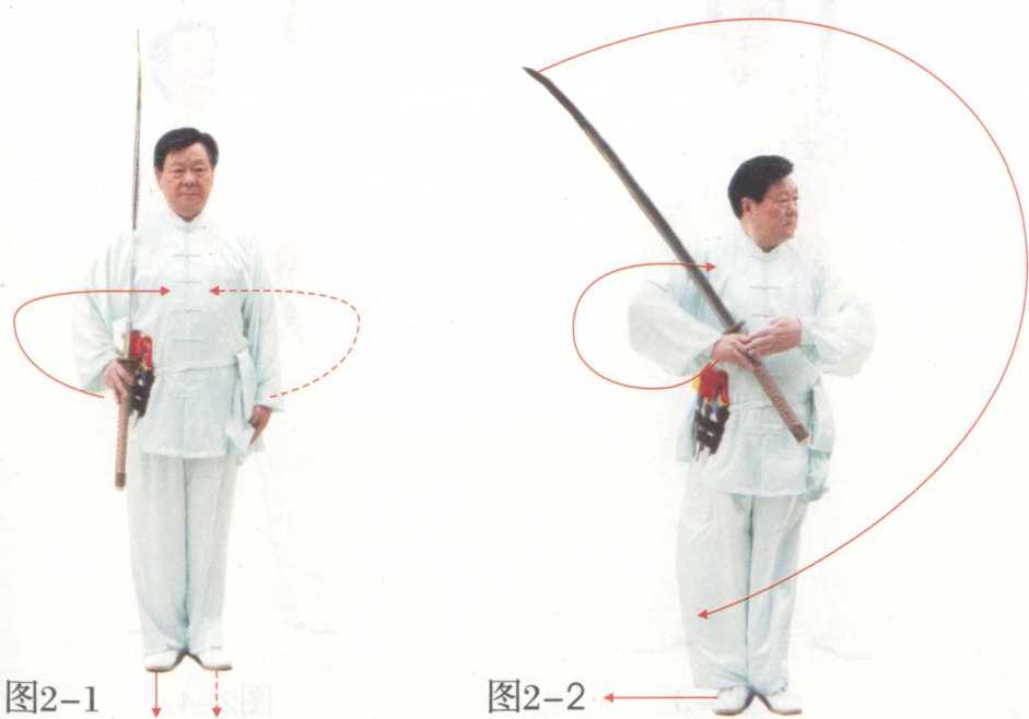 立正站立,两脚并步,身体正直;右手持刀置于 腰间,右臂弯曲,左臂下垂,眼向正前方看去。(图 2-1) o