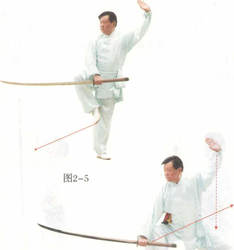 接上势。右脚向右开一步;右手握刀,虎口向 下,将刀经身前自右向左向下划弧成180° ;刀柄向 上(图2-3)。然后再用力将刀向上抛出(图2-4); 右手迅速反手接刀,虎口向上,同时提膝成左独立步 (图2-5),小指处抵住刀柄护手;经胸前向左下方 划弧,同时右腿向右方挪开,成右弓步。右手反握刀 向右前方刺去,刀身平放,刀刃向下,刀尖微上抬, 成弓步压刀势;左手向左方划弧至头顶亮掌,眼向右 前方看去。(图2-6)