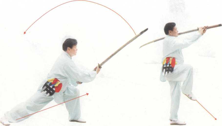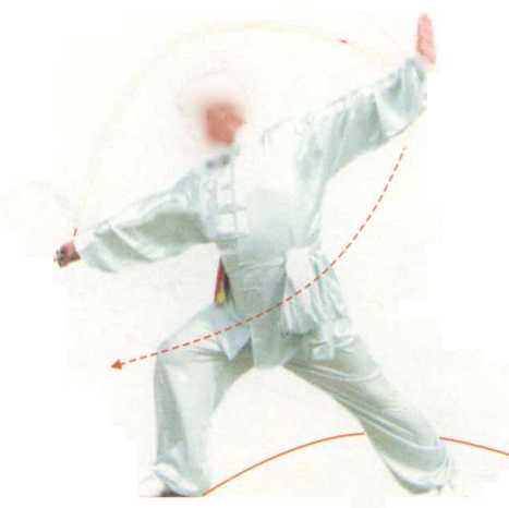 【动作要领】旋转要快, 扣。刀和身体、步法要协调一致, 腿后伸,左掌前挑,动作要一致。