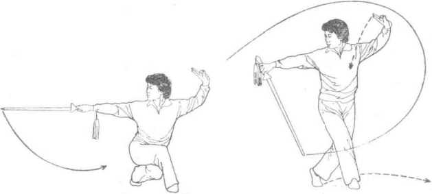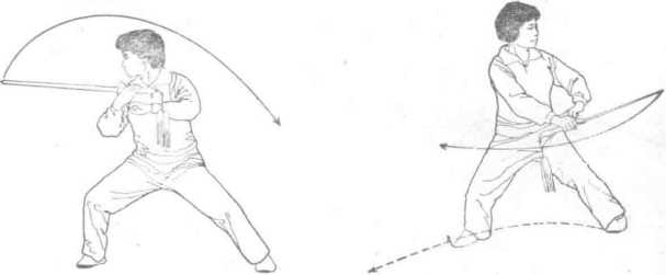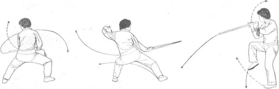 (3)重心左移,腰微左转,右 臂内旋,右手松握剑柄,剑尖下 落。然后重心右移,腰微右转, 右前臂外旋使右手剑向左向上向 右向下划弧至身体右前方。这时 重心又移向左腿,腰微左转,剑 柄于右膝上约10厘米,剑身要平, 剑尖朝右。左剑指在右手剑向右 向下划弧时向左向下向上划弧于 头左前方,手心朝外。目视剑尖 方向。
