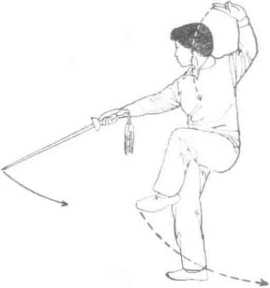 右脚落地,右腿自然伸直, 上体微左转,重心全部移于右腿, 左腿屈膝提起,脚尖自然放松。 同时右手剑朝右前下方立剑刺 出,手心朝左,剑尖朝右前下方, 力注剑尖,左剑指向前向上向左 至于头左上方,手心斜向上。目 视剑尖方向。