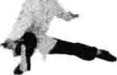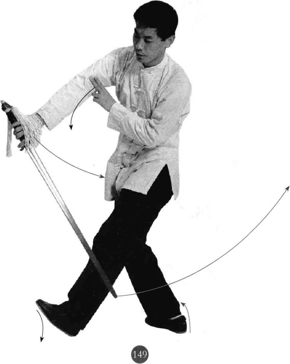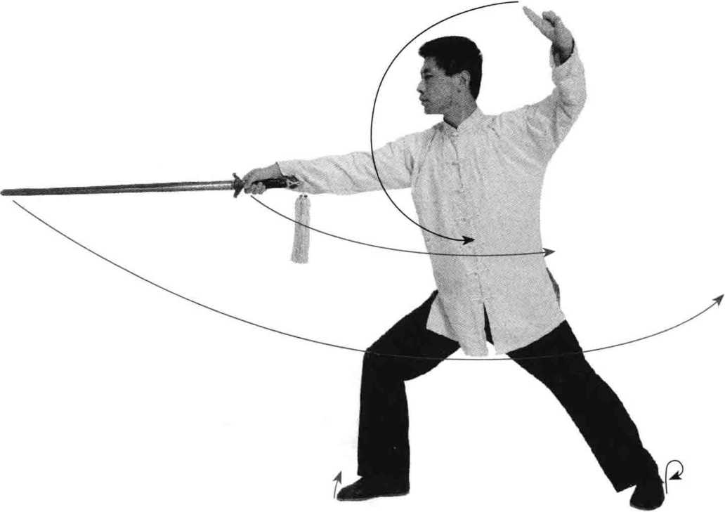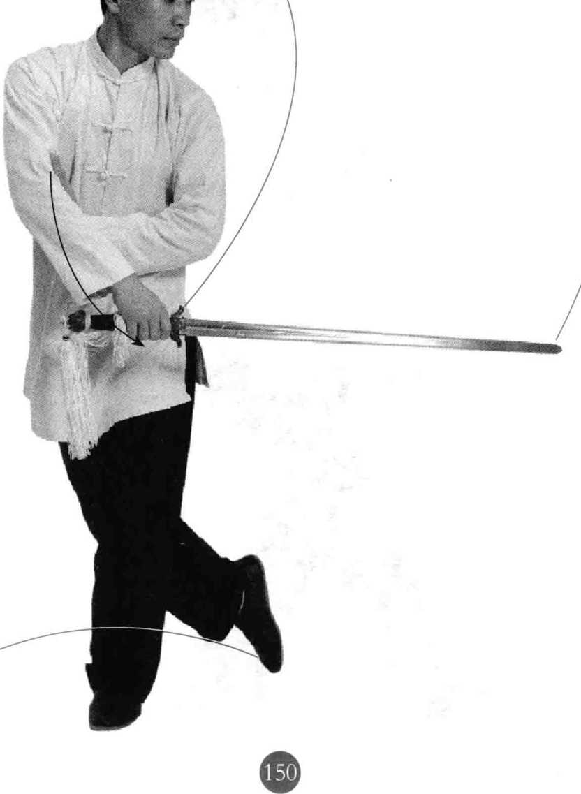 ② 接上动,左脚外摆45度落,屈左膝,重心平移至左腿,蹬起 右脚脚跟;同时右手经右膝外撑继续立圆挂剑于身后,左手剑指附于 右大臂内侧;目视剑身中段。