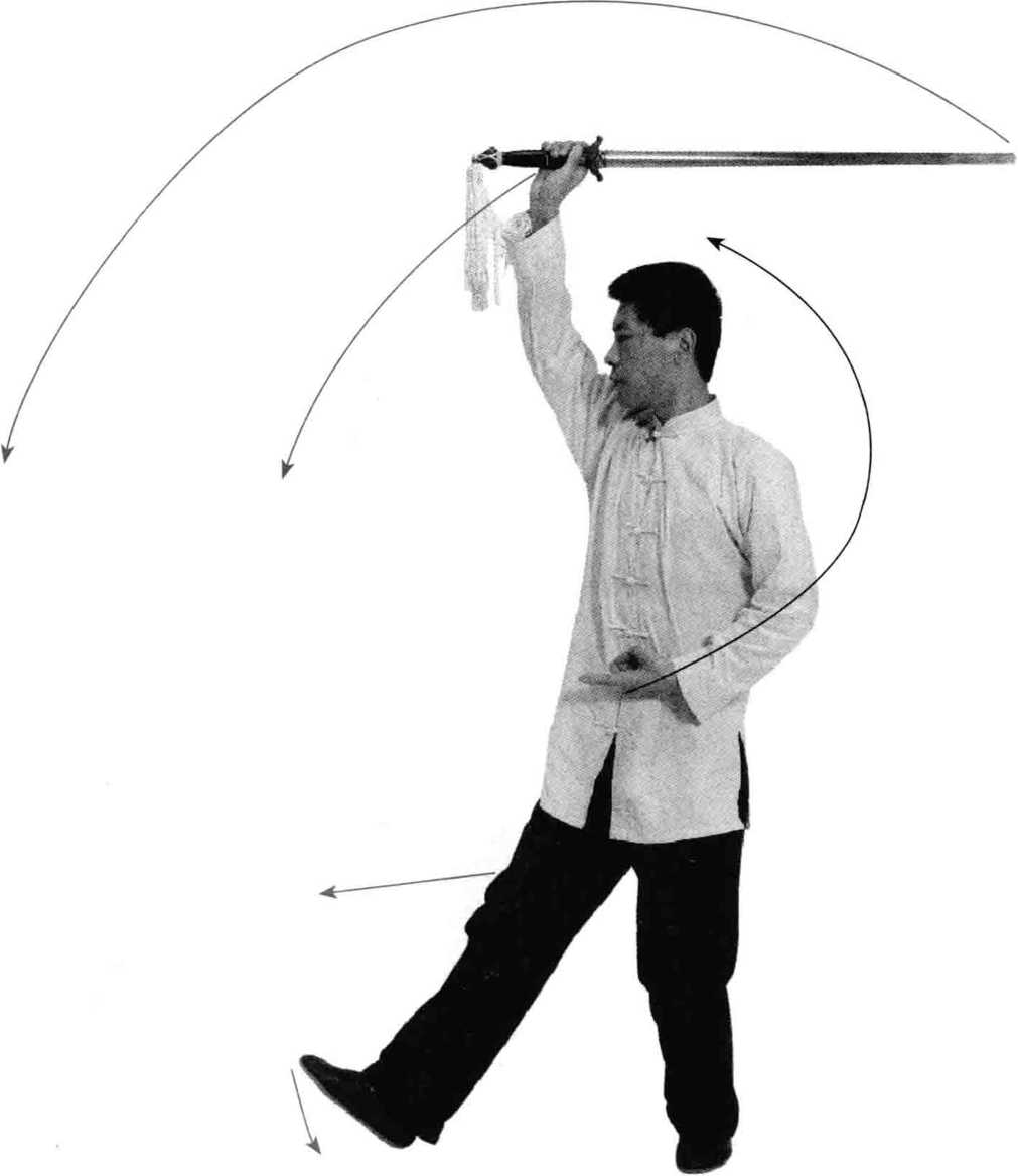 ③ 虚步举剑:向前出右脚,脚跟着地,成右虚步;同时上体微 微左转,右手持剑外旋上举于头上方,左手剑指外旋沿弧线下落至左 腰间,掌心向上;目视前方。