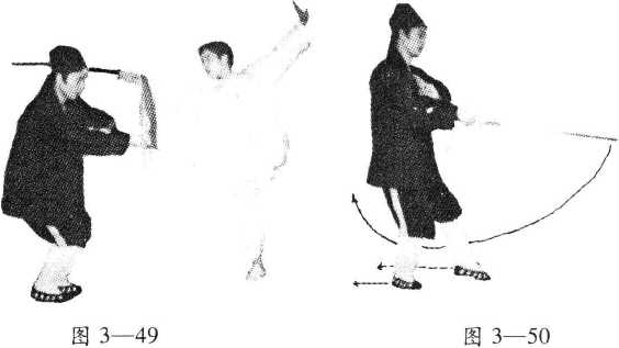 (1)接上式不停,退右步同时右手持剑向外挽剑花一■ 周,左手剑指随右腕的转动而同时转剑指一周;再退左步 同时右手持剑向外挽剑花一周,左手剑指随右腕的转动 而同时转剑指一周;再退右步同时右手持剑向外挽剑花 —周,左手剑指随右腕的转动而同时转剑指一周;(如图 3—50)