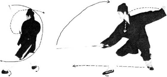 (4) 动作不停,左腿向右腿后叉一步,重心前移右腿. 左腿伸直,脚掌落地,足跟抬起;身体左转90度;同时左 臂屈收,左手剑指随之向右、向上、向下至右胸前;右手持 剑由右向上、向左反刺剑。目视左前方。(如图3—53)