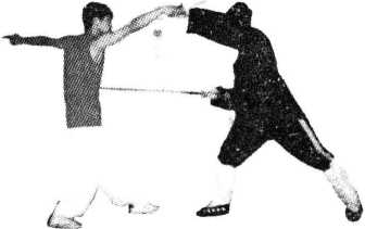 挫。(如图3—55)(3)反刺剑的应挫。(如图3—55)(3)反刺剑的应身上步,左手托架对 方持械的手腕,右手 持剑平穿对方的心 脏或肋部,对方必受 用。对方持械突然从后面袭来,侧身倒叉步,避开来势,同 时反手持剑,直捣对方面目部位,对方必后退或受伤。(如 图 3—56)