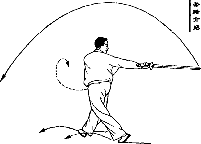 要点:身体要先左转再右转。视线 随剑移动。