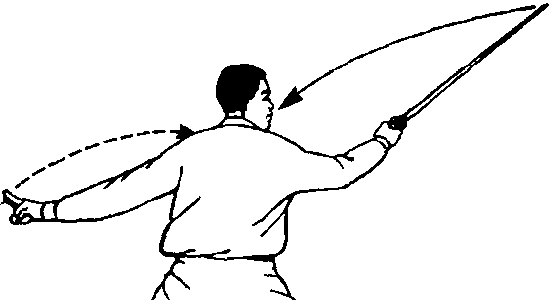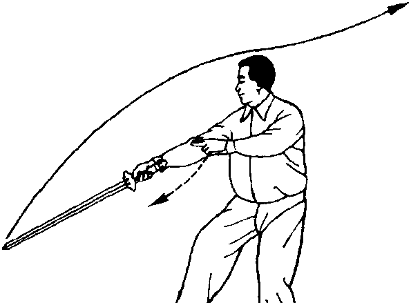 交叉成半坐盘式,右脚跟离地,同时 右手剑向身体左后方穿挂,剑尖向 后;左剑指仍附右腕上;眼向后看剑 尖(图四十八)。