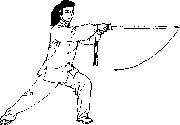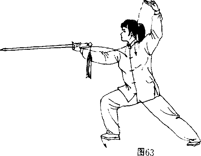 身体继续左转,左脚尖稍外撇,右腿自然蹬直成 弓步;同时,右手持剑向左前方劈下;眼看剑尖(图 65)。