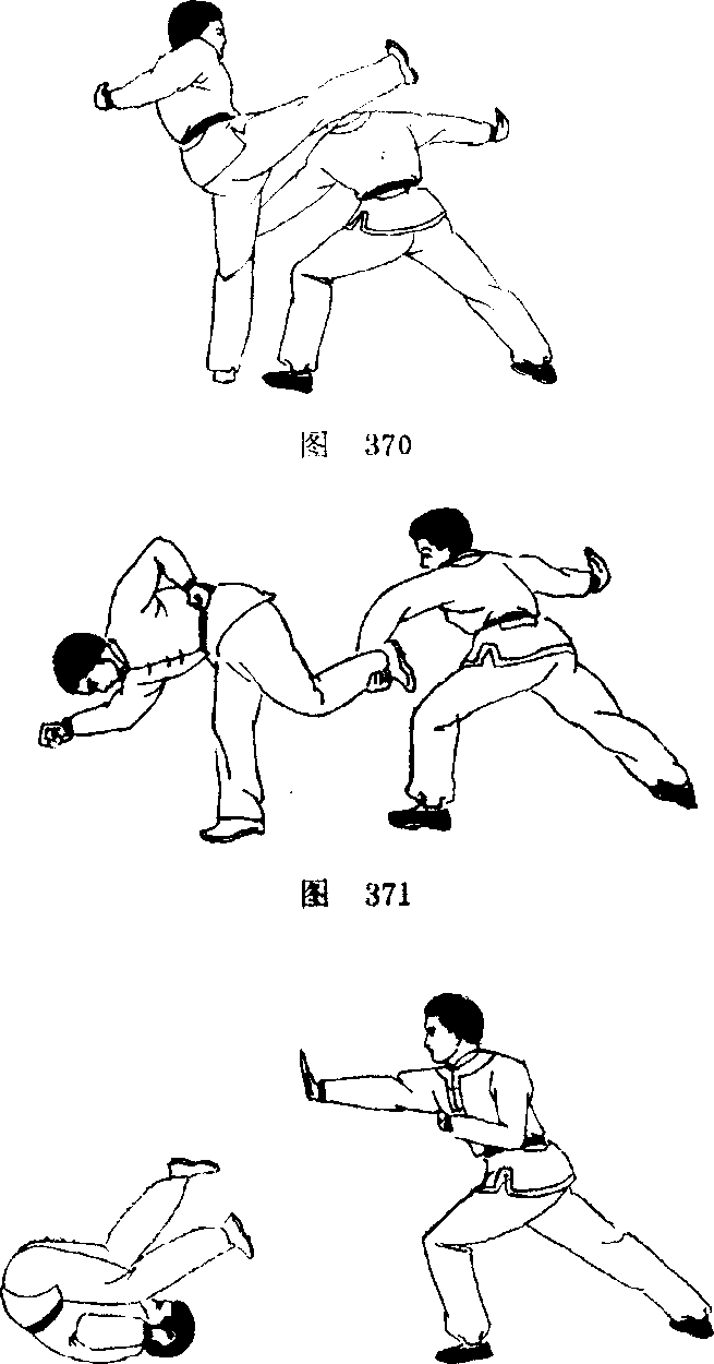 1 .甲方,用左掌将乙方左掌向外拨开下压(图369) 0 2 上动未停,甲方即用右腿向乙方头部跨摆里合踢击(图 370)。3.乙方,低头俯身让过甲方的骑腿踢击,顺势用左手 反臂将甲方左腿抄住扳起。甲方的右脚此时已经随着里合摆 动的惯性的量转至正西方向落地,身躯则受乙方的掀腿而向 前栽(图371)。4?乙方,右勾手变掌,从身后用肘经右腰 侧向甲方臀部直臂推伸,左手则向上掀起。甲方,立即团身 向前做枪背渔寓动作(图372)。