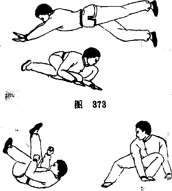 1.乙方,当甲方滚翻之后将要站起的时候从后面向甲方 跃起扑去,意欲将甲方扑倒在地。甲方,迅速将身伏下避 让,使乙方扑空(图373)。2?乙方,扑人落空,两掌前窜落 地,立即屈肘、团身做前滚翻动作。甲方此时两掌推地站 起,眼视乙方(图374)。