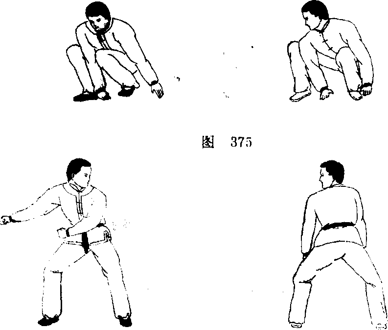 1 .紧接上动,乙方滚翻后盘腿坐起(图375)。2?上动 未停,甲方立起从左向后转身,右脚随之向东跨步面向正 北。乙方立起面向正南(图376)。3.上动未停,甲、乙各自 做三百六十度旋转的旋风脚动作(图377)。