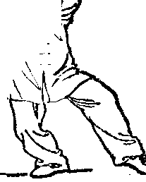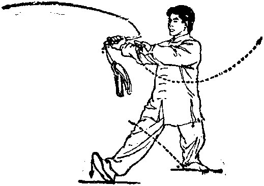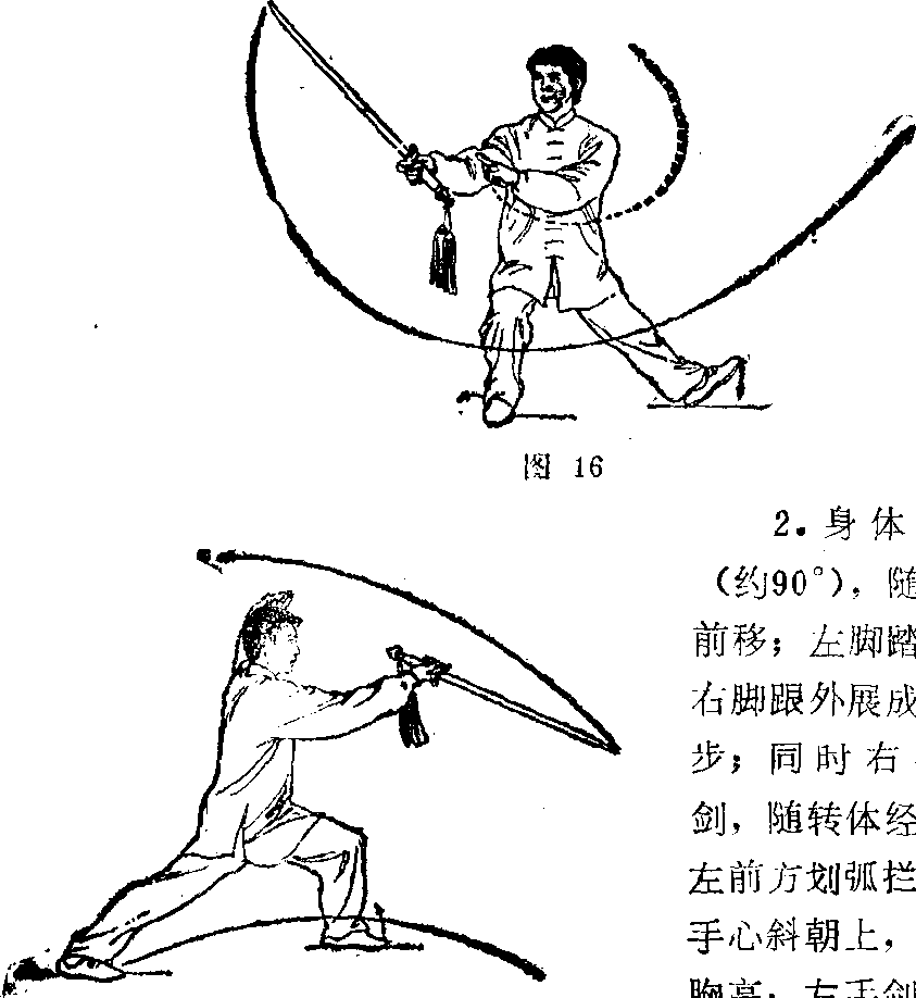1 ?右腿屈膝半蹲,上体略左转,左脚向左落步,脚跟着地; 同时右手握剑以腕关节为轴使剑尖在体前顺时针划一圆弧: 左手剑指附于右前臂内侧,手心朝下多目视剑尖方向(图16).