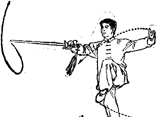 身体转动与剑绕环要协调一致。弓步时上体不可前俯。